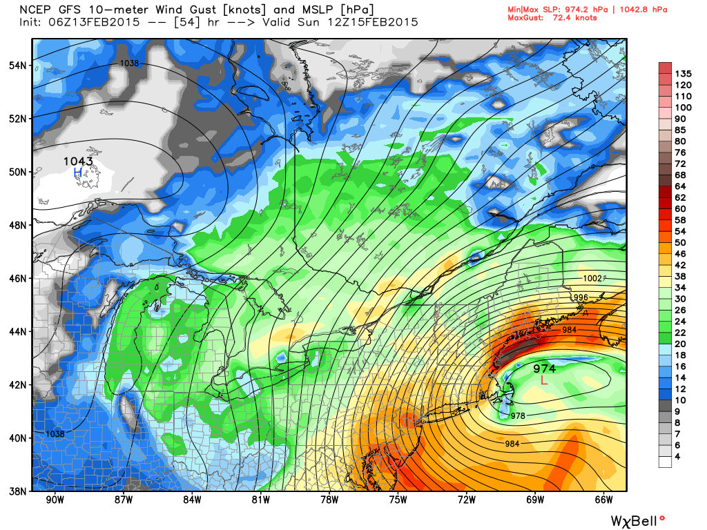 Our confidence is currently highest in 2-4″ of wind driven snow (we’ll get to the “wind driven” part in a moment) over New Jersey and New York City, with 4-8″ of snow possible over Eastern Long Island, Connecticut and areas into Southern New England. Higher amounts are possible if the inverted trough does in fact set up over the area — but confidence in its location and intensity are quite low at this time. One of the main stories moving forward from the snowfall — and hazardous conditions as a result of it — will be winds.