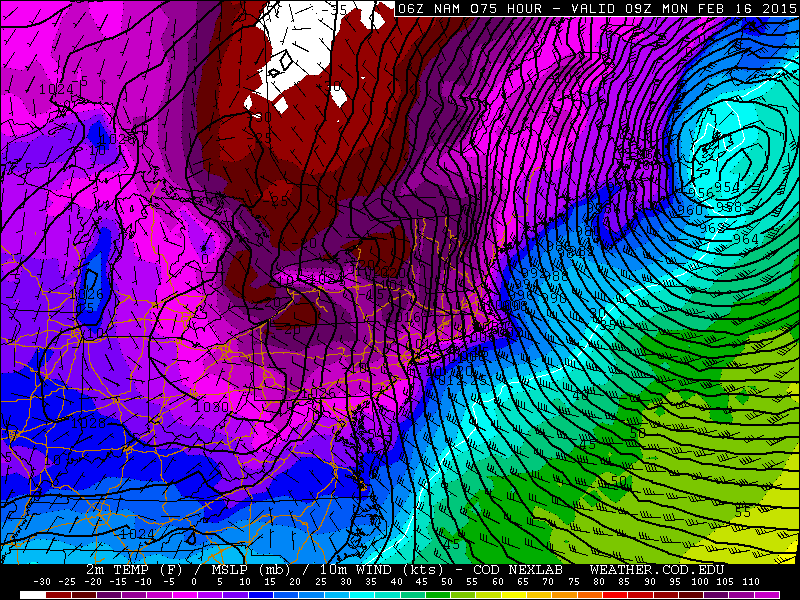 The airmass behind the storm system will be borderline historically cold. Models indicate a high likelihood of mid and low level temperatures dropping to their lowest of the winter so far. The Euro, for instance, shows 850mb temperatures of -27C near the area on Monday morning. The result of this, with the snow cover in place and strong northwesterly winds, will be the potential for record-breaking cold. Most models, at this point, take New York City’s low temperature below 0 F on Monday morning.