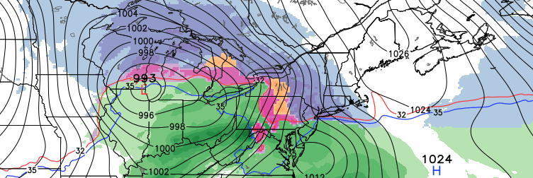At the present time, it becomes important to look at the components of the mid and upper level atmospheric pattern. This setup, while able to bring us prolonged winter weather should the chips fall on the table correctly, almost always favors New England for the brunt of the snow. Additionally, forecast models currently are in good agreement that the mid level vorticity — and mid level low centers — will track well to our north and west. This is a classic model signal for mid level warming and precipitation type changeover in our area.
