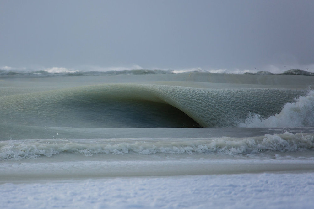 These waves are the same as any other ocean wave, except for the fact that the surface of the ocean is covered with slushy ice. The top layer of the ocean waters are very close to freezing over — but the temperature of the water isn’t quite supportive of that especially given continued water movement and the waters depth. So what you get is a layer of slush and pockets of icy water on the top, creating an amazing scene as the waves crash ashore. These are known in the area as “slushy” or “slurpee” waves.