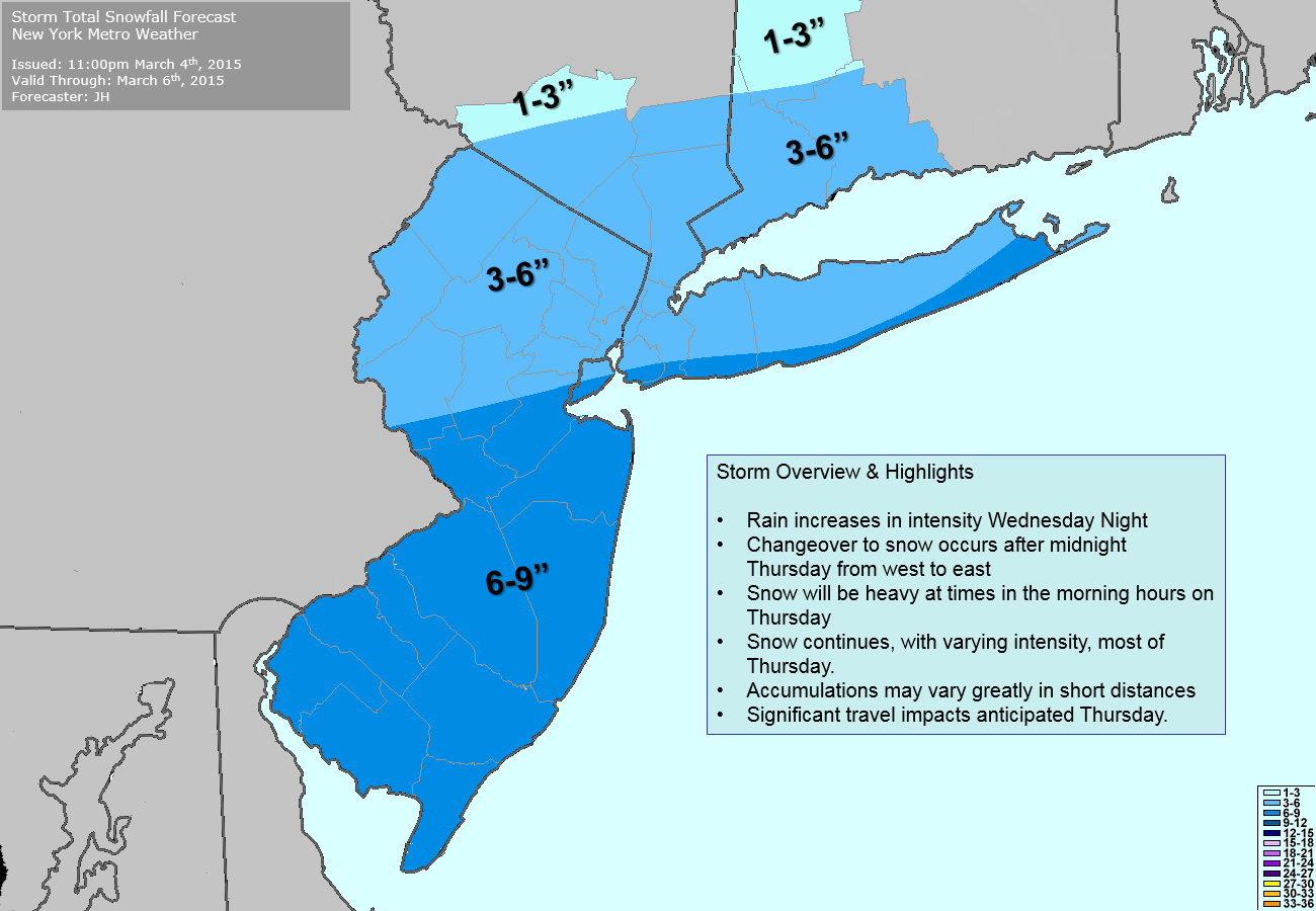 11:00pm: We have updated our Storm Total Snowfall Forecast. Only minor changes were made; namely to sharpen the northern gradient and snowfall cutoff and to bring 6″ amounts slightly farther north. Otherwise, the forecast remains unchanged.