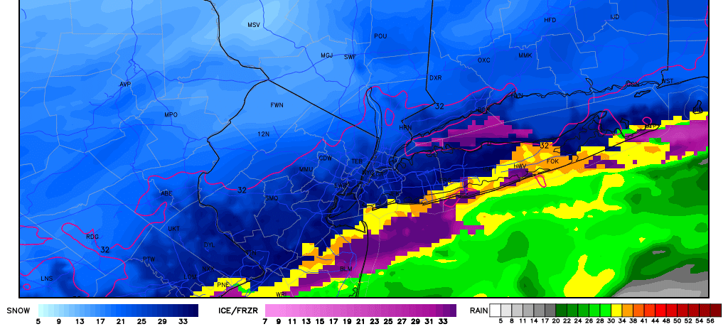10:30pm: Both the GFS and NAM at 00z tonight have trended toward a snowier scenario for much of New Jersey and New York City. Both models agree that after around 2am tonight, rain will change to snow which will be heavy at times. They have moved northward with banding on Thursday which could bring moderate snow to much of the area during the day. Below, the GFS from tonight shows that band over New Jersey and NYC on Thursday morning and afternoon.