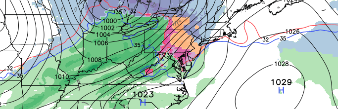The first threat will come Tuesday Night into early Wednesday Morning. A classic “southwest flow event”, as meteorologists often refer to it, will transpire throughout the Northeast United States. A low pressure system will be well to our north and west — over Canada — drawing in southerly winds and warmer air, but low level cold air over the Northeast will hold on long enough to allow for a period of snow.