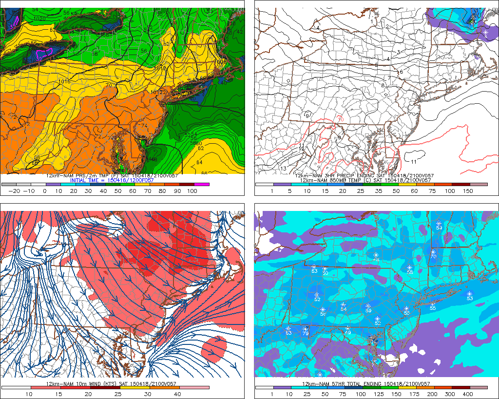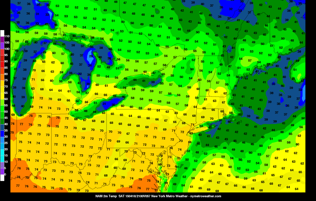 Verbatim, the NAM is showing highs generally in the low 70s, though cooler on the east end of Long Island, where the winds abruptly turn to SW. But with a strong NW flow and 850mb temperatures of around +8C, we actually think the low 70s the NAM is showing is the floor for high temperatures on Saturday. With how dry it’s been and will continue to be on Saturday, the NW flow assures that we will be mixing deeply with this warm airmass, keep clouds away, and should maximize our potential warmth. This means that upper 70s for most of the area are likely, and we can’t even rule out an isolated warm spot hitting 80 degrees! Definitely make sure to get outside and enjoy it.