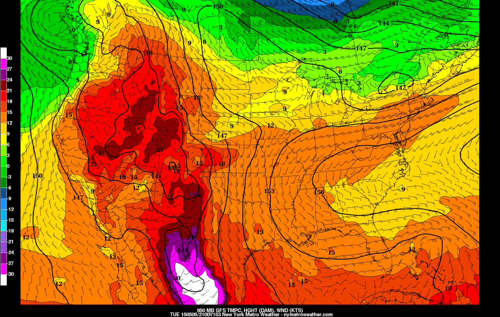 Come Monday, the picture looks quite different. The trough has departed and the ridge — which was initially relegated to the western two thirds of the country — has pushed eastward into our area. 850mb temperatures have warmed above 10C with a westerly and southwesterly flow at that level, making temperatures in the low 80s possible on both Monday and Tuesday — especially Tuesday when a few mid 80s are possible.