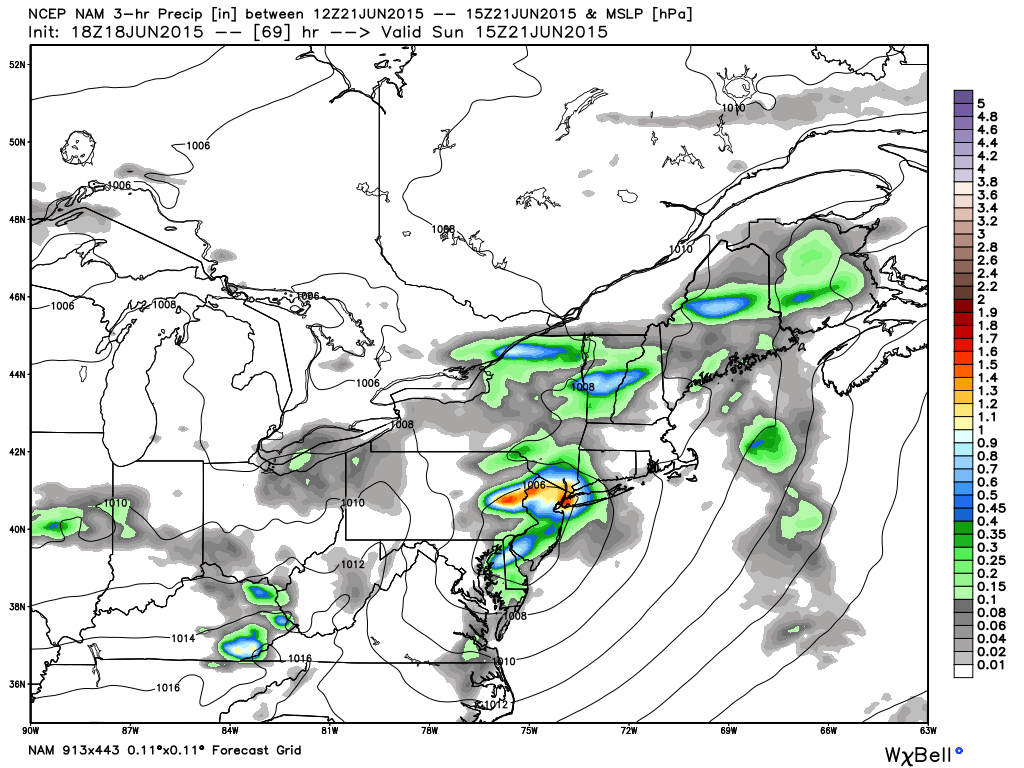 Sunday won’t be much better, as the forcing and disturbance associated with the remnants of Bill approaches our area. A weak surface low pressure system will track from the Mid Atlantic to the Northeast Coast. This will aid in the development of precipitation, some of which could be heavy, during the day on Sunday. Tropical rains with embedded thunderstorms are anticipated for a period of time during the day on Sunday.