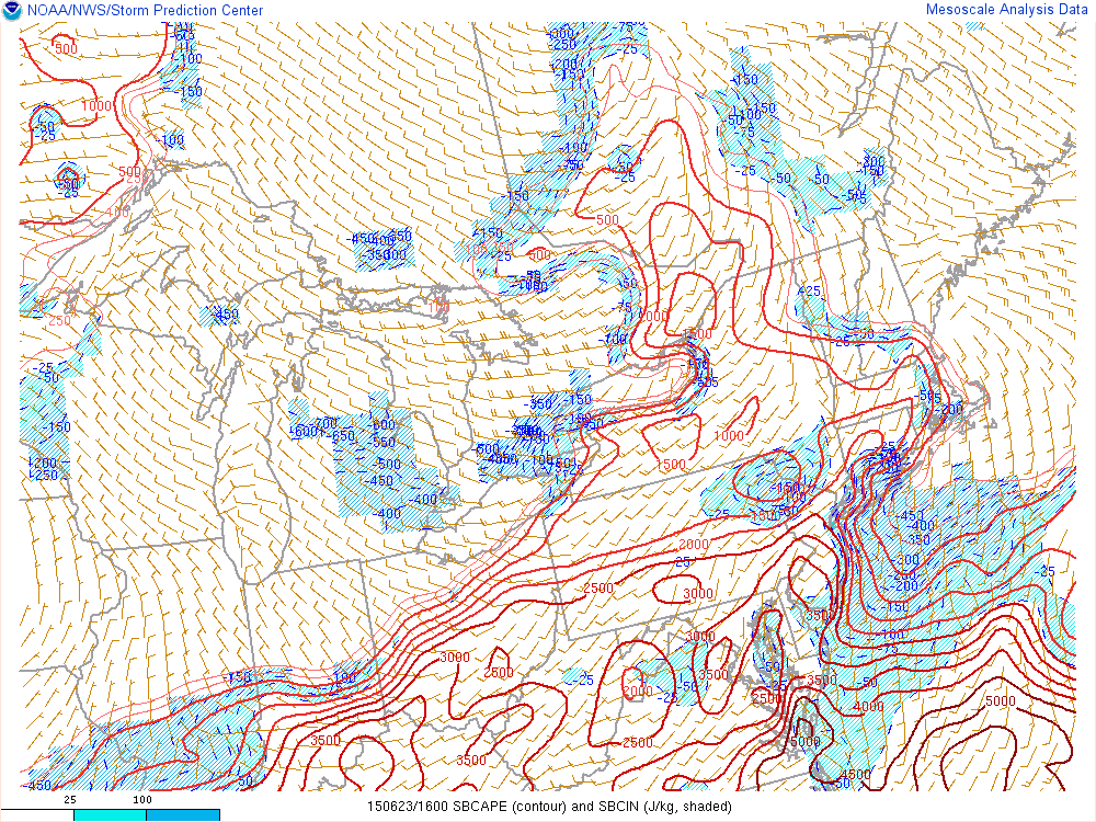Thunderstorms are forecast to develop over Northern Pennsylvania and New York State, and begin progressing southeastward throughout the day. Meanwhile, atmospheric destabilization will occur over much of New England, the NYC Metro, New Jersey, and the Mid Atlantic. Instability parameters are expected to be quite high, especially by Northeast US standards. With more than adequate wind shear for thunderstorm organization, these storms are expected to spread southeast toward the coast during the late afternoon and evening.