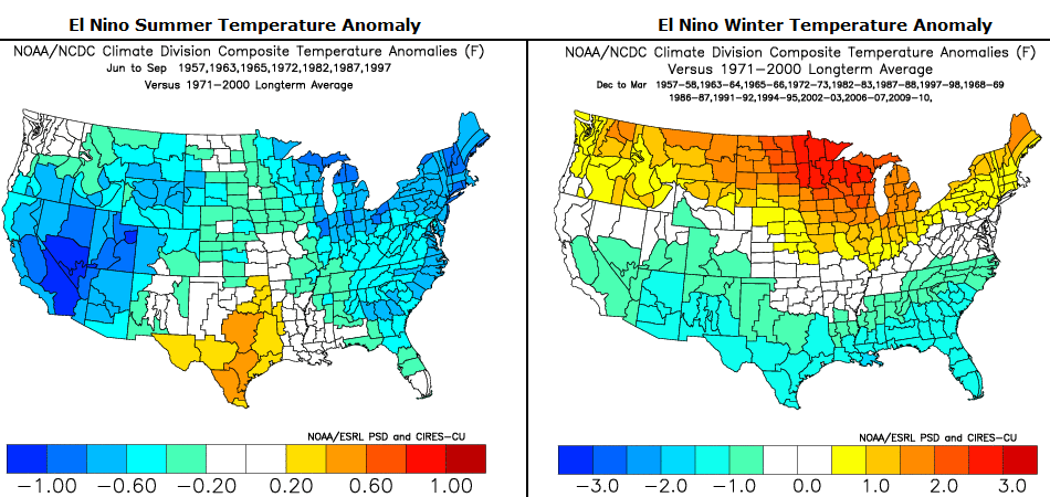 In New York City, the effects of a moderate or stronger El Nino can be notable. The dataset and composite images above show temperature departures from normal during moderate or stronger El Nino events in the past. Temperatures here during the summer months average about one full degree below normal. Conversely, during the winter months, they average about one full degree above normal. These aren’t small numbers, they correlate strongly with the changing atmospheric circulations discussed above.