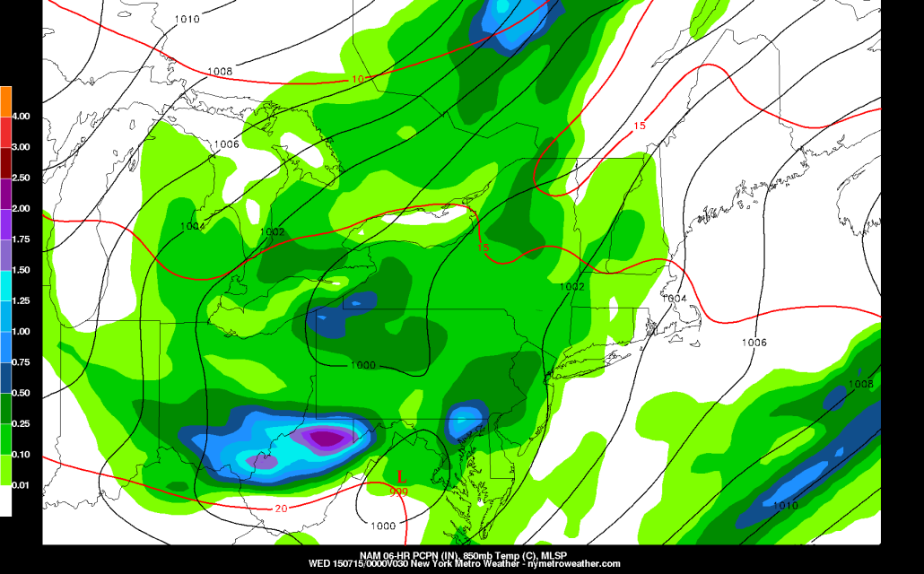 - A warm front will be approaching late Tuesday night and early Wednesday morning, from the south. Along this warm front, a secondary area of low pressure from the initial system in the Midwest will be developing just to our south. This will cause more lift in the atmosphere, and when combined with the already moist airmass, could lead to showers and thunderstorms with locally heavy downpours and some loud thunder. The atmosphere will not be supporting severe thunderstorms with strong wind gusts, as the mid-level flow looks quite weak.