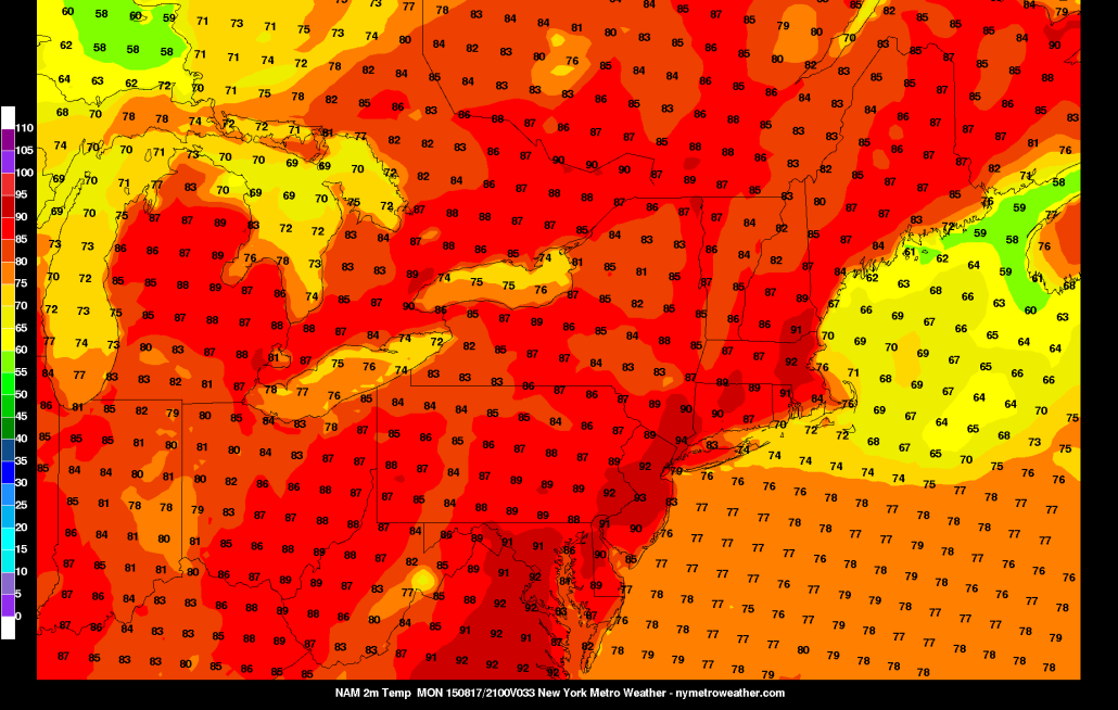 - Perhaps the hottest day of this heat stretch will be tomorrow, with highs in the low and perhaps mid 90s in some spots. This is because there will be a bit more of a westerly component to the wind. Skies will be mostly sunny. A few showers and thunderstorms are possible on Monday night into Tuesday morning as the airmass becomes more tropical.