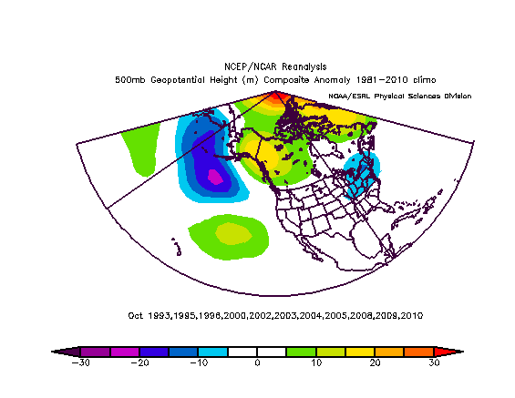Interestingly enough, when you roll the composite forward to the month of November, the pattern becomes more anomalous — and changes quite dramatically. Ridging develops from the Northeast Pacific along the West Coast of the United States. This ridging is very important in allowing colder than normal air to filter southward into Canada and eventually the United States during the month of November: