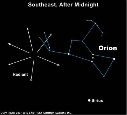 The general radiant point of the meteors will be to our southeast, near the constellation Orion. But you don’t need to find this constellation to see the meteors. If you’re in a dark location, they will move throughout the sky and originate from different points.