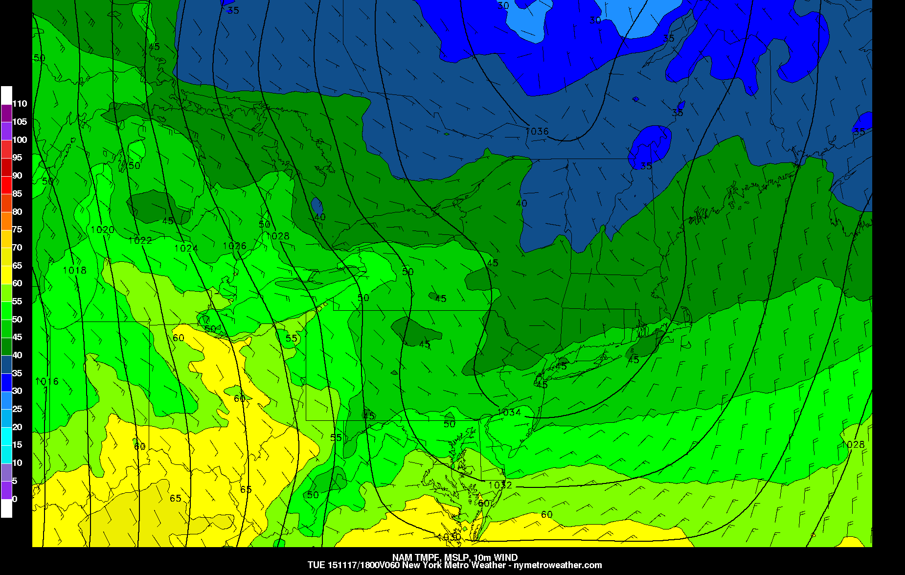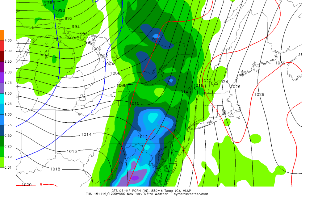 Today’s 6z GFS shows showers with heavy rainfall and strong southeasterly winds for Thursday (Image courtesy of PSU Ewall)