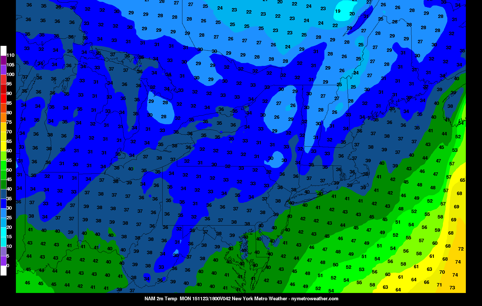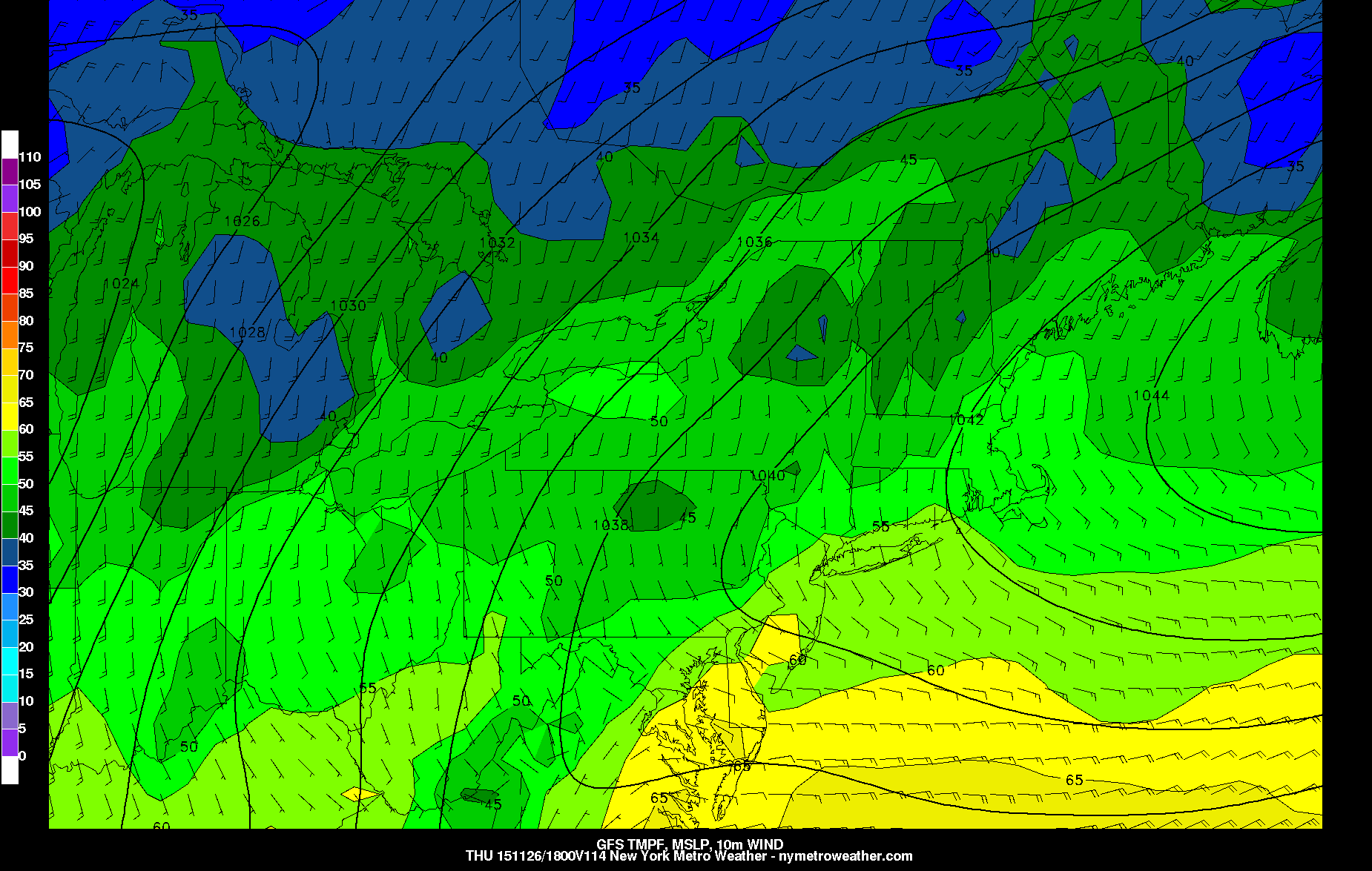 The GFS showing temperatures in the middle to upper 50s with light winds for Thanksgiving in NYC Metro