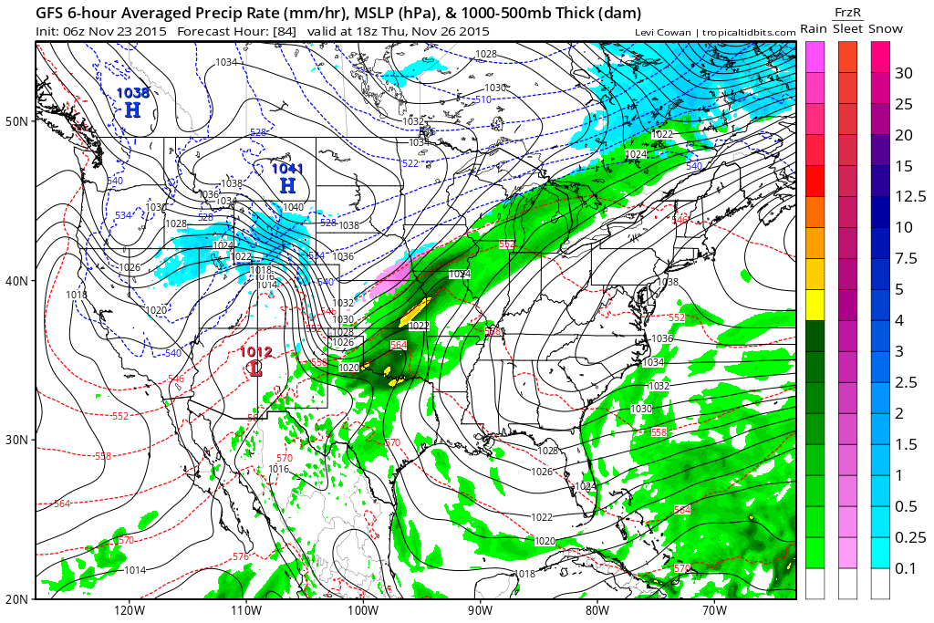 By Wednesday and Thursday, a frontal zone will set up well to our west over the Central United States, specifically the Mississippi Valley on Thursday. For our area, this ensures no brutal cold air, as winds will have a more south and easterly component. But most importantly, it also ensures that no significant precipitation is expected on Thanksgiving.