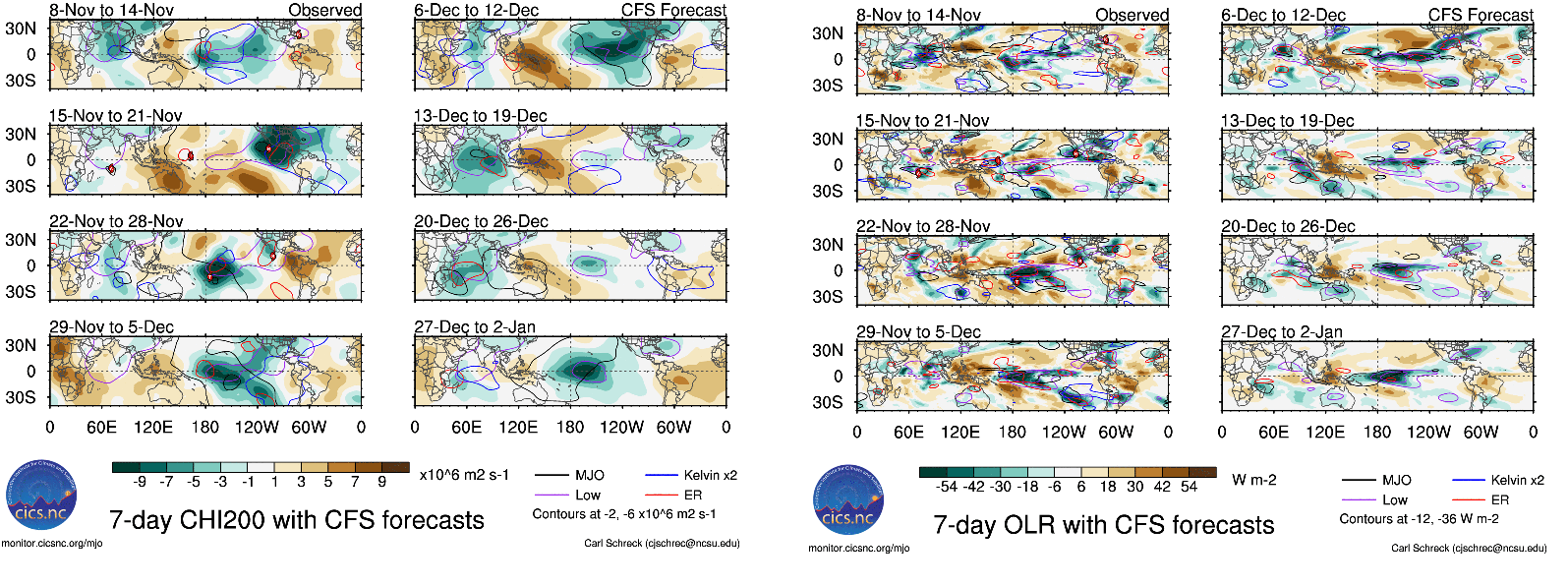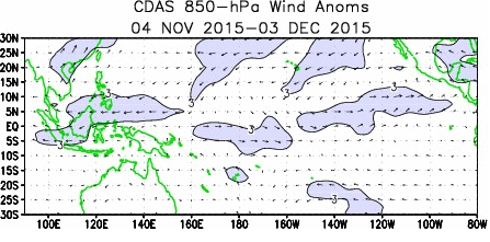 In November, the warm oceanic Kelvin wave continued to downwell between 140W to 100W. But later in the month, a sub-surface cold SST anomaly began to move east, from the Western Pacific. This might be an indication that Kelvin wave activity is gradually subsiding