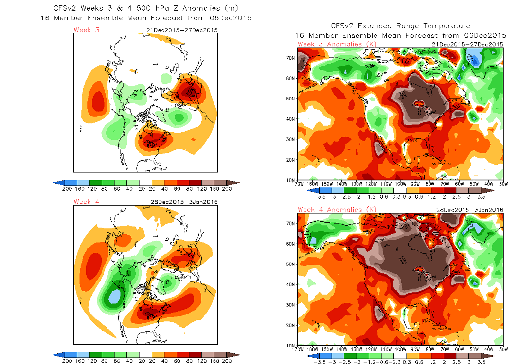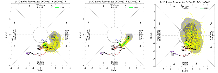 The ECMWF ensemble forecasts show the MJO/tropical forcing signal in phases 3 or 4 over the next 11-15 days. If correct, either phase 3 or phase 4 would support a trough over Gulf of Alaska region and strong ridge over Central and Eastern US for middle to late December. The UKMET ensembles also agree with MJO/tropical forcing signal in phases 3 and 4. in this week. Euro weeklies have the MJO forecast in phase 4 than perhaps propagating through phase 5/6 into early January.