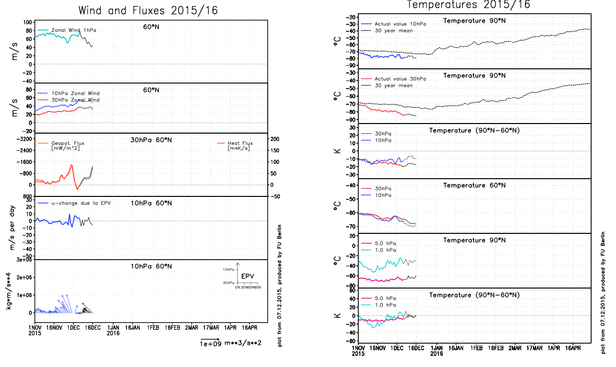 A significant rise in temperatures, easterly zonal winds, and more poleward EP flux would indicate the beginning of a sudden stratospheric warming event. The ECMWF forecasts over the next days, for westerly zonal winds to continue. The geopotential and heat flux are forecast to drop than rise late into the period. EP flux vectors at 10 hPA are also mostly pointed equatorward (westward). EP vectors shift poleward than back equatorward with EP flux weak. 10 hPA and 30 hPA temperatures between 90°N – 60°N are forecast to remain steady or slowly drop .