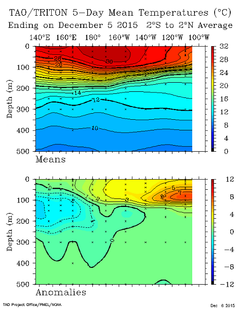 TAO/Triton showing the thermodecline between 100m-200mb and subsurface cool over Western Pacific over 5-days from Dec. 5th. Warmer subsurface anomalies now over Eastern Pacific