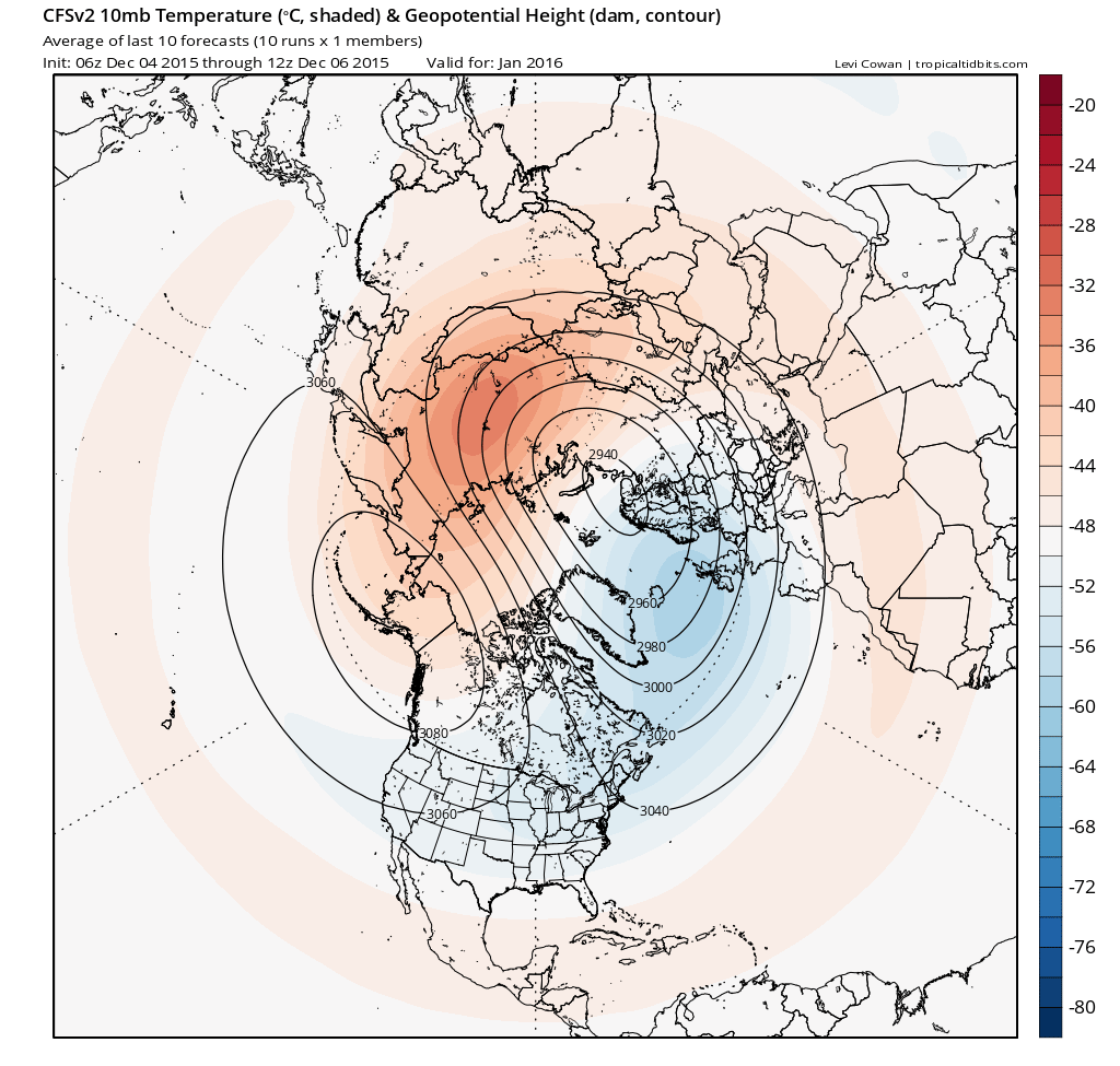 Thanks to Tropical Tidbits we can now see 10mb temperatures and heights on the CFSv2 weeklies and monthlies. This model is showing a polar vortex displacment beginning sometime between the end of this month or early January. If correct, this could support the GOA trough/low retrograding and allow more ridging over NE Pacific or on the West Coast (-EPO/+PNA) within 2 or 3 thereafter. These pattern changes are often rushed on the model guidance. But we are anticipating some weakening or displacement of stratospheric polar vortex by middle January, due to high Eurasian snow cover ,varient tropical forcing, mountain torques, etc through the period. This will lead to high-latitude blocking developing in late January, and thus a change to colder and snowier conditions by February.