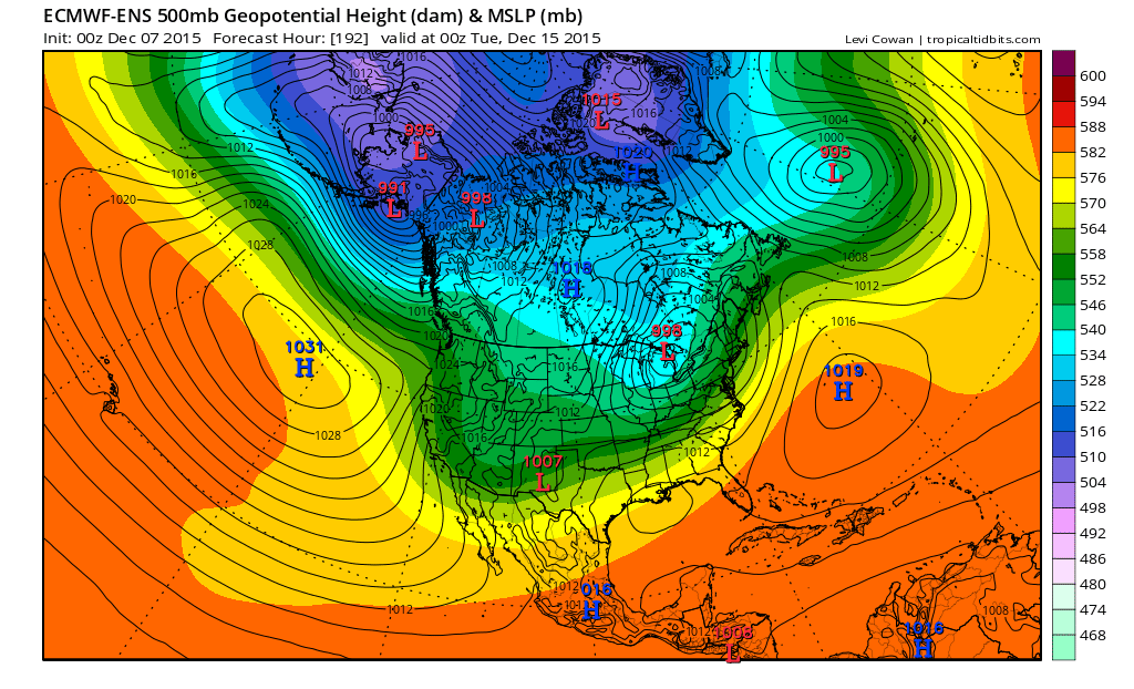 There is some uncertainty as to whether or not this tropical forcing is being induced by El Nino or actually MJO wave activity. Either way, the forcing will support trough/low over the Gulf of Alaska with Pacific air flowing into CONUS through Christmas. This trough could start pulling back west closer to New Year’s Day.