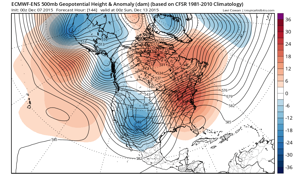 The 0z/07 ECMWF Ensemble mean showing strong ridge over Eastern North America and trough extending down the West Coast of North America