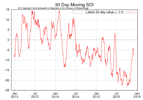 The Southern Oscillation Index measures the difference of between air pressures over Tahiti and Darwin, Australia. A lower negative value indicates below normal pressures over Tahiti and above normal air pressure at Darwin, thus supporting stronger El Nino conditions. The monthly for November was -3.23 up from -21.30 in Oct. The highest monthly average value since April.