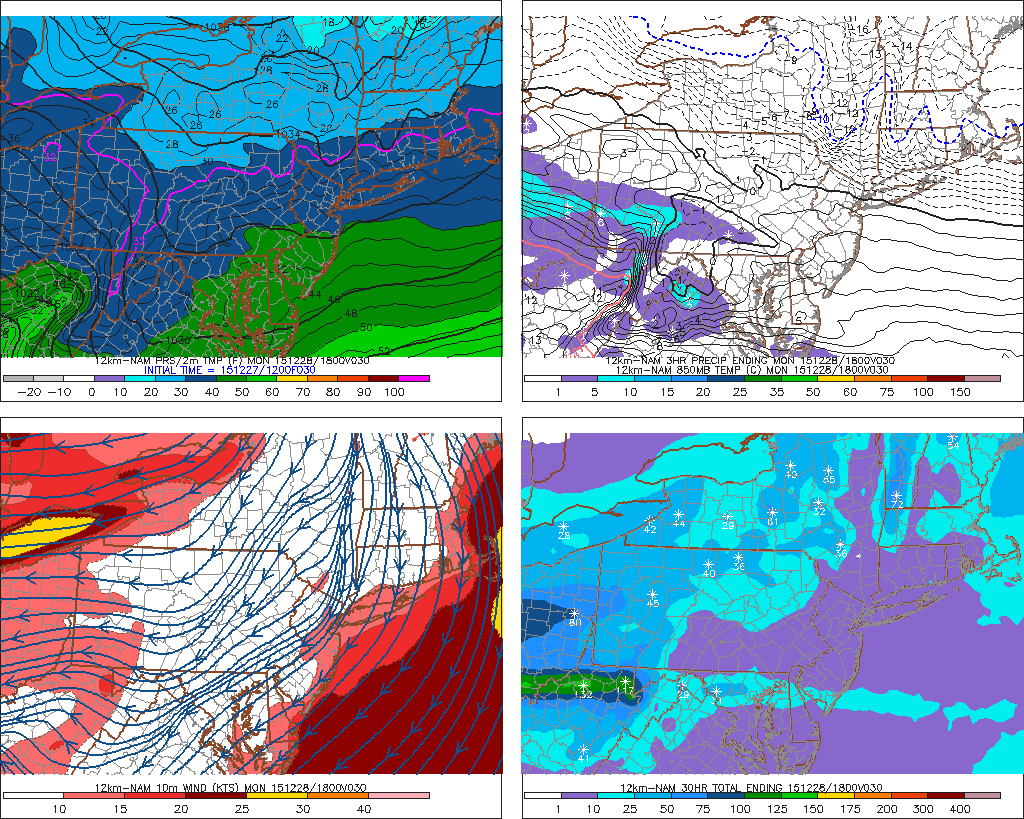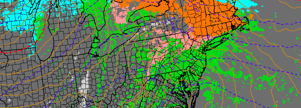 Therefore, we expect precipitation in the form of sleet and rain for New York City, Long Island, tomorrow night. Then–as more easterly winds bring warmer air off the ocean–precipitation will change completely to rain by the Tuesday morning rush hour. Over Central and Southern New Jersey, the entire column will likely be warm enough for just rain.