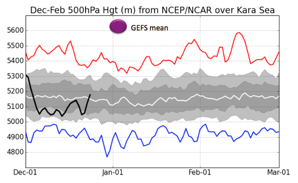 Research on height records in the Kara sea during the months of December, January, and February shows that the GEFS are forecasting this ridge to be the strongest ever during this time period — by a fairly wide margin. Only a few years come remotely close to the strength of the forecasted ridge and heights in the mid levels of the atmosphere. This ridge will be a catalyst in setting off changes to the mid level atmospheric pattern.