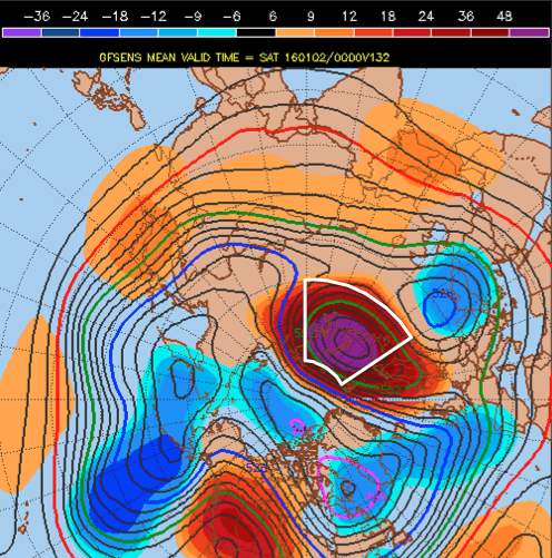 As it develops, it will push northwestward toward the higher latitudes near the Pole, aiding in the development of some high latitude blocking. When juxtaposed with a ridge on the Western part of North America (which we will discuss shortly) it helps disrupt the polar vortex which had previously, for much of December, been quite stout and centralized.