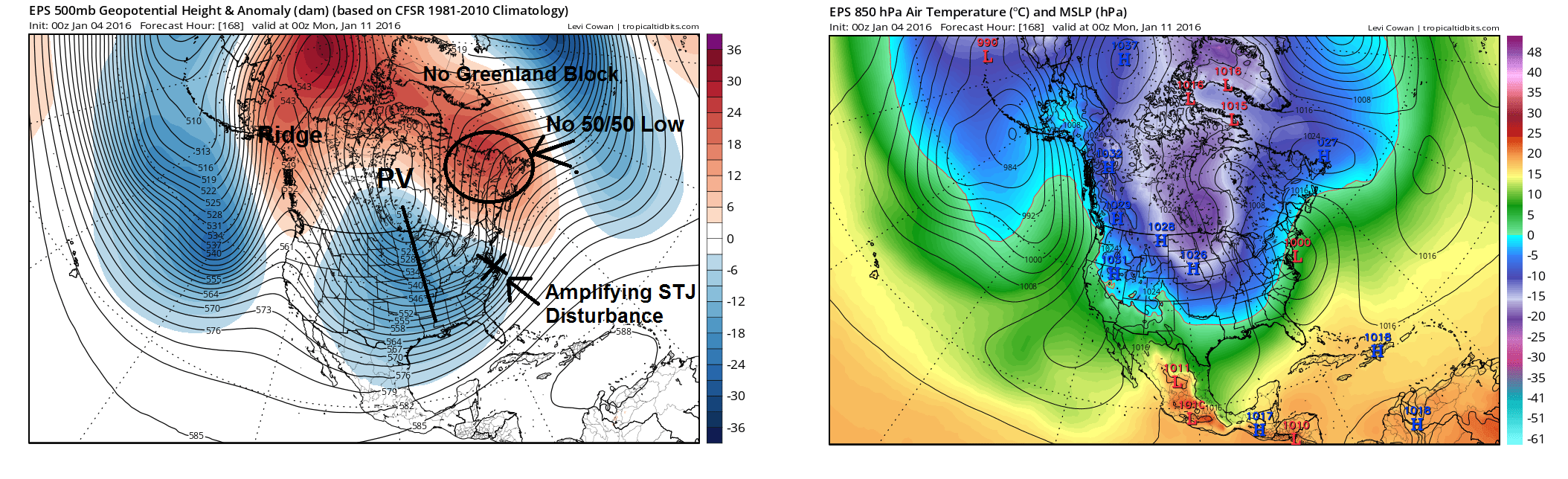 The Euro Ensemble Mean analysis for January 10th-11th. A major snowstorm is very unlikely for the I-95 corridor, without a Greenland Block or 50/50 low.