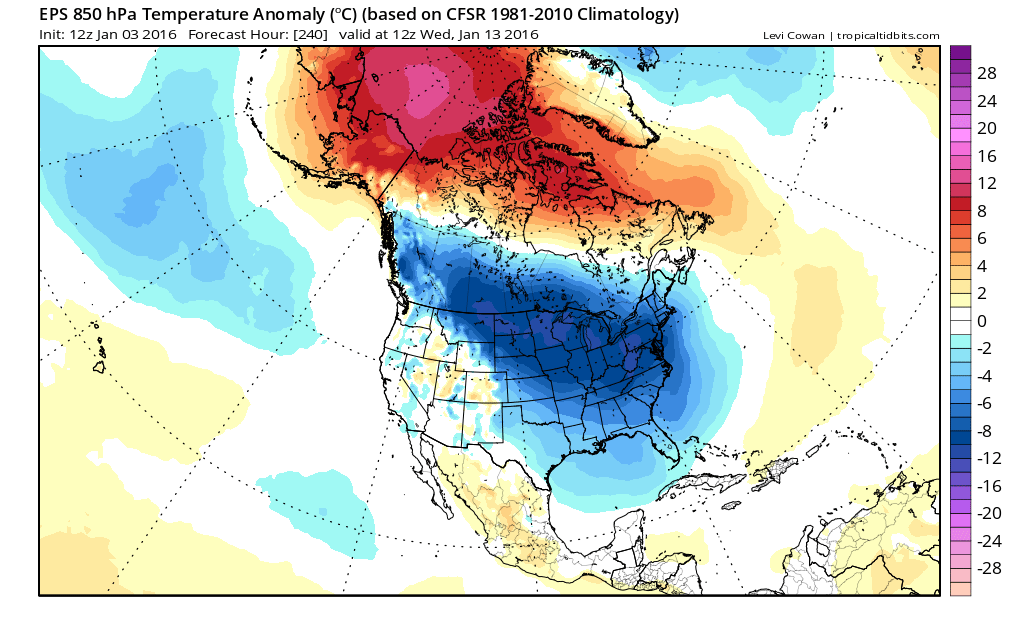 The Euro ensemble mean showing artic air with 850mb temperature negative anomalies invading the much of the United States by January 13th.