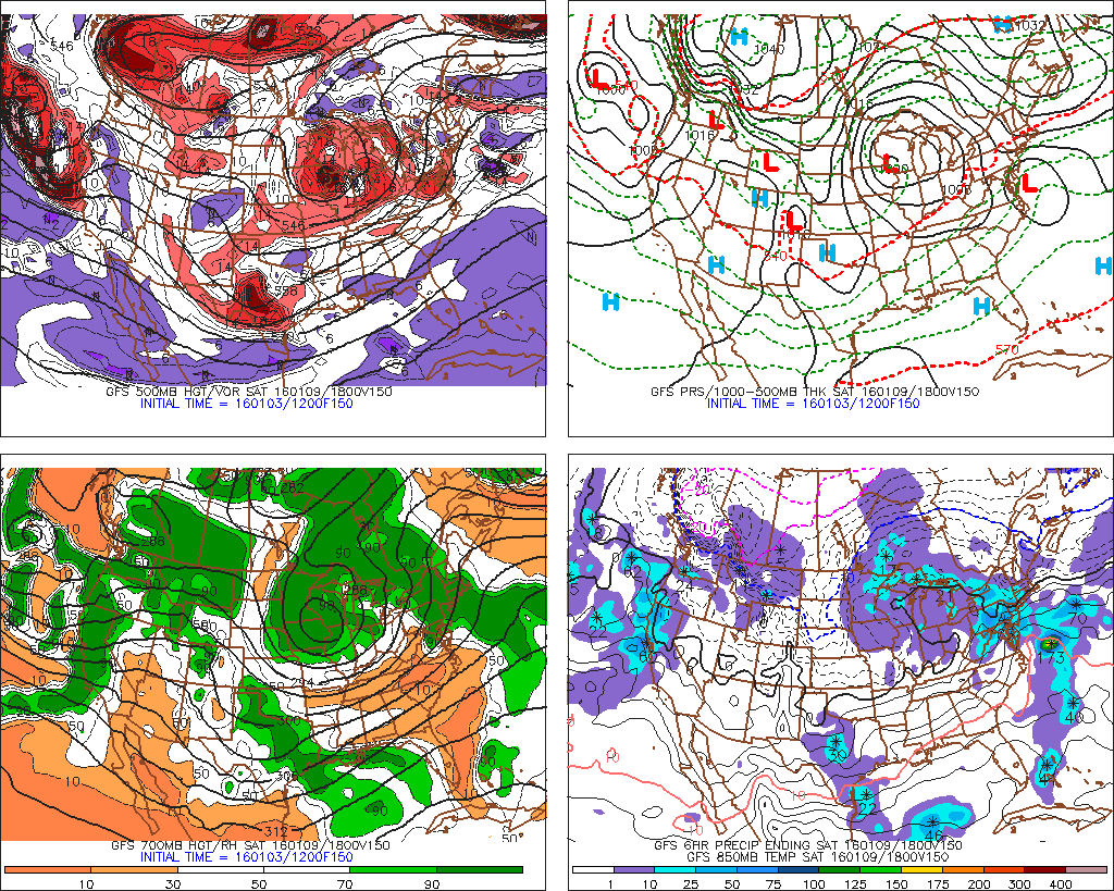 The GFS showing precipitation in region with secondary low for January 9th (Image Credit: PSU Ewall)