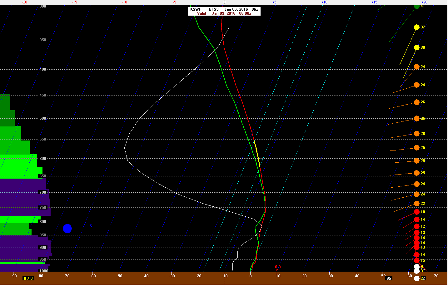 GFS Bufkit sounding showing light snowflakes for early Saturday morning for Newburgh,NY. With moderate omega (lift) and mositure in snow growth zone near 600mb and near or below freezing temperatures below.