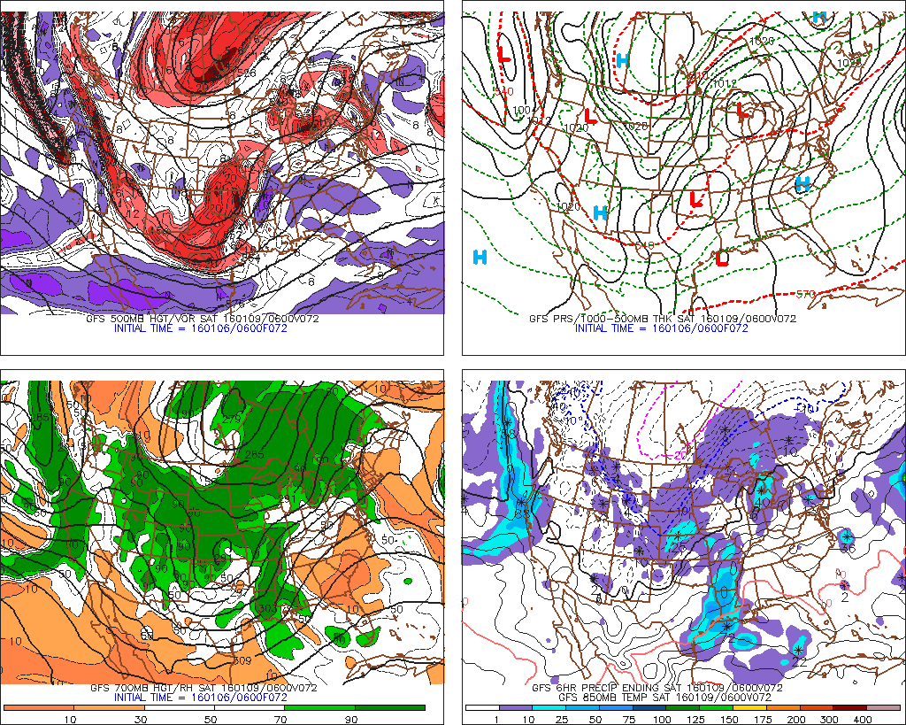 The GFS Friday night showing the high over Quebec, causing some low-level cold air damming ahead of a weak system extending from the Great Lakes Another low-pressure system getting more organized over the Central Plains.
