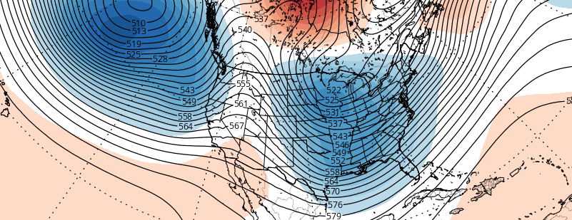 The lead subtropical jet shortwave is interacting or phasing with the upper-level low over Central Canada. This causes a full-latitude trough to amplify and take a negative tilt over Central Plains with heights building into Northeast US. In turn, this forces the 50/50 low and confluence zone to lift out of Southeast Canada. The cold airmass over the region begins to moderate. This shortwave, along with a strengthening upper-level jet streak, causes low pressure develop over the Ohio Valley and another a secondary low to form near the Southeast coast. These lows do not merge into one major storm until they track into the Canadian Maritimes.