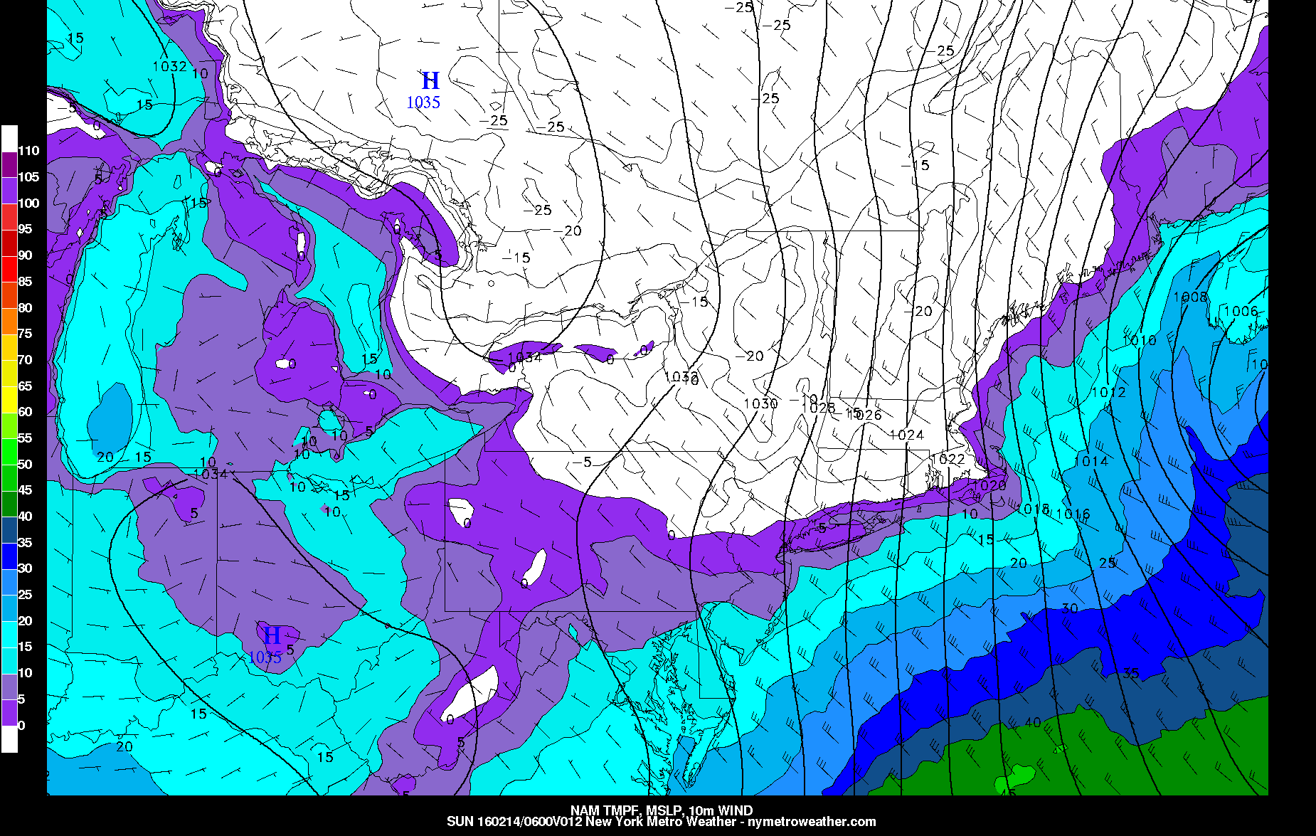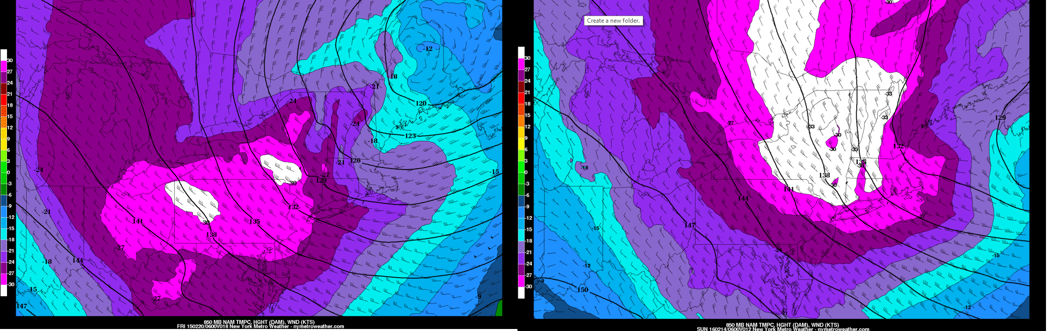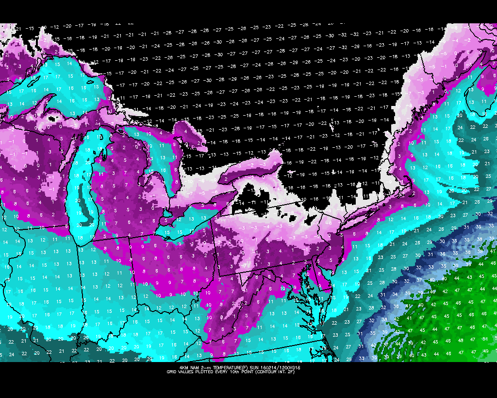 On February 20th, 2015, NYC got down to +2F, and on January 7th, 2014, NYC got down to +4F. There are certain criteria we look for to see how cold it can get in NYC: 1) 850mb temperatures, as they are a good indicator of the airmass, 2) Timing and degree of cold air advection — NYC due to the Urban Heat Island Effect does not cool off very much from radiational cooling, so they are very reliant on cold air advection, 3) Wind direction — generally a more northerly flow can more efficiently draw trapped colder surface air from the valleys, whereas a more westerly component has the tendency to downslope off the Appalachians and thus moderate somewhat when it hits us, and 4) Degree of mixing — if the surface air “mixes” with the airmass aloft, not as much cold air will be trapped at the surface, making it hard to truly go below zero.