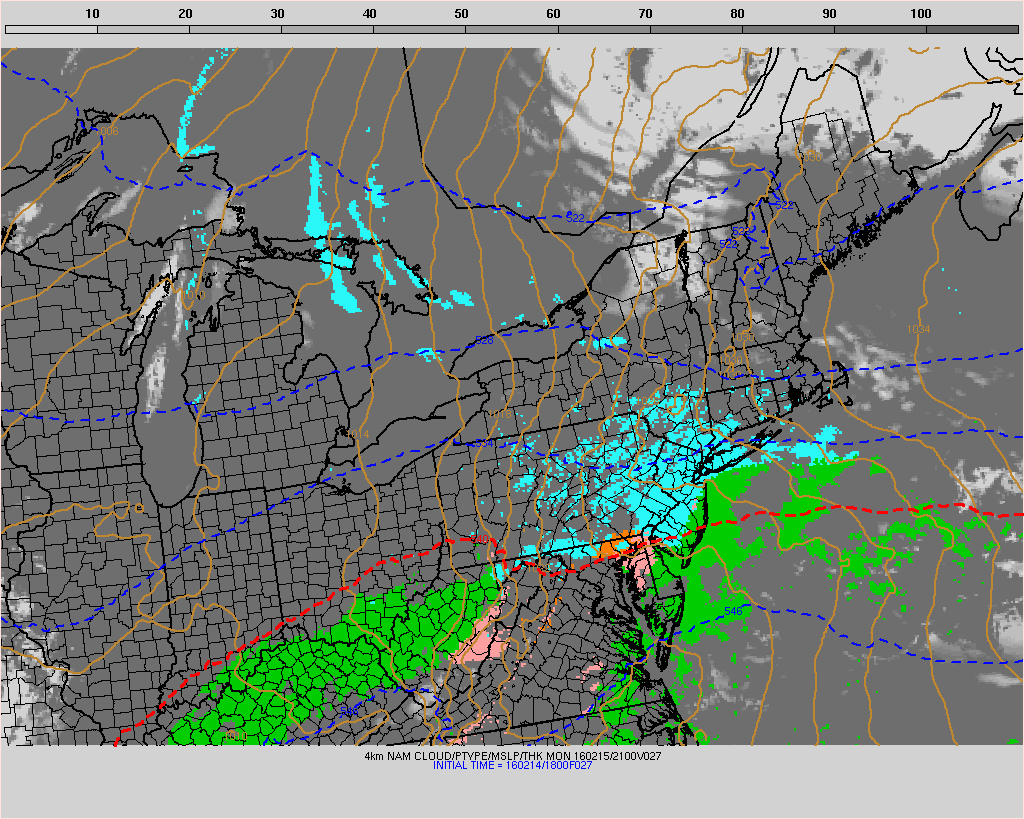 After bitter and record-breaking cold this weekend, attention turns to another storm for tomorrow. This will be a large, complex storm system that will impact the region starting at around Noon. Low pressure will organize over the Southeast United States on Monday, as high pressure slides out to sea. This combination will push a warm front northward through the Mid-Atlantic region during the day tomorrow. Light snow is likely to spread from southwest to northeast during the afternoon hours.
