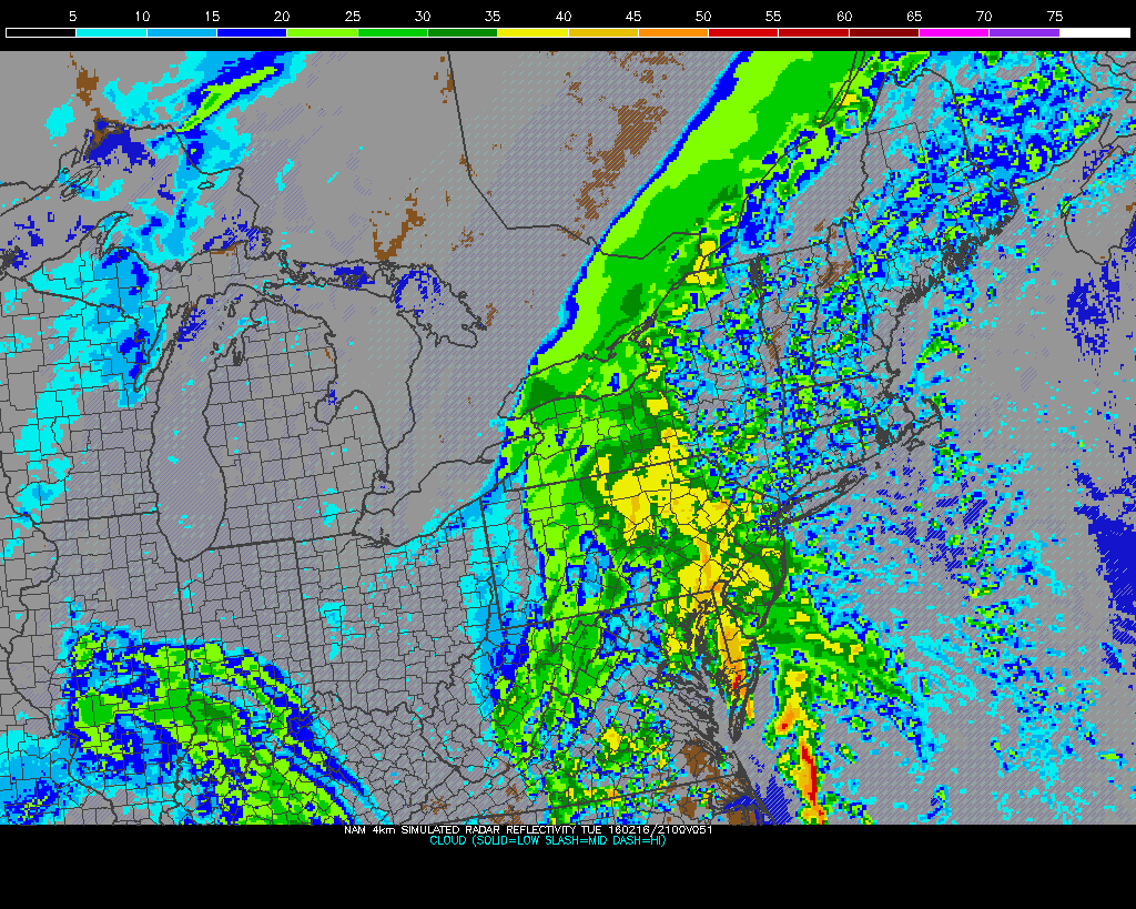 The NAM showing strong southeast surface winds into and along the coastline Tuesday evening (PSU E-Wall)