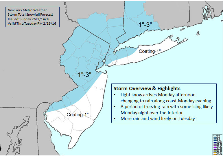 Snow will fall lightly to moderately at times. Generally, 1-3″ of snow is expected between Noon and 4-6pm (perhaps lasting as long as 7pm for NW NJ where locally 3-4″ is possible), before a mix with and changeover to freezing rain and then rain is likely to occur over the region, with lesser amounts in Suffolk County and the NJ Coast (see the map below). This is because southeast winds will cause temperatures to rise above freezing into the middle 30s. Freezing rain may still last for about an hour or so, given that waters are quite cold, so onshore flow won’t warm us up as quickly as usual. Additionally, roads are quite cold, so 33F and plain rain falling could then freeze on the roadways. Further north and west, the aforementioned effects are amplified. A changeover to freezing rain is more likely to occur and be sustained tomorrow evening, as cold air near the surface will be slower to leave. In these areas, temperatures will likely remain at or below freezing until later in the evening or the overnight hours. Roadways will be slick with icing likely for the interior locations, and even somewhat for coastal areas as well, though not the same extent as the interior. The worst of the snow and ice could be during the PM Rush-Hour, so leaving extra time and having ice scrapers may be wise.