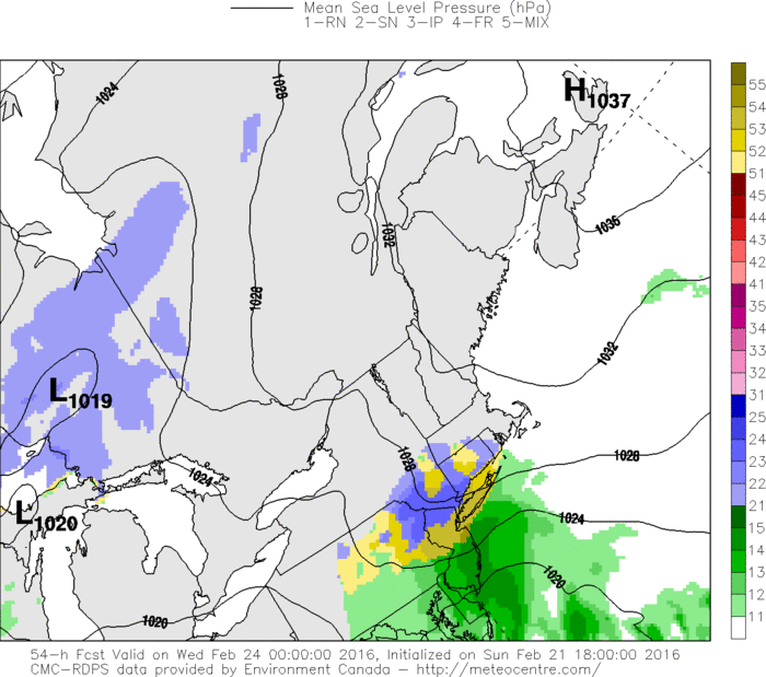 There are a number of reasons why this storm will more wet than white. First, the polar vortex is positioned near Baffin Island doesn’t support keep more cold air with trough axis further east. This actually support the northern and southern stream phasing much further west over Great Lakes or Ohio Valley regions. The 500mb heights that build over Greenland are very transient and don’t keep an upper-level trough/low over Southeast Canada to support confluence or cold high pressure to remain to the north. Instead we see the Western Atlantic ridge building into the East Coast and Southeast Canada. Strong high pressure moving east of Nova Scotia will cause winds to turn more easterly off the warmer ocean waters. The overall pattern shown on model and ensemble guidance is not favorable for winter weather in our region.