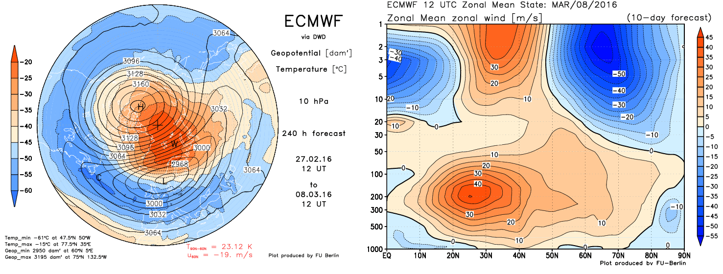The ECMWF stratosphere forecast. Warming taking over the north pole at 10 hPA and zonal winds reversing.