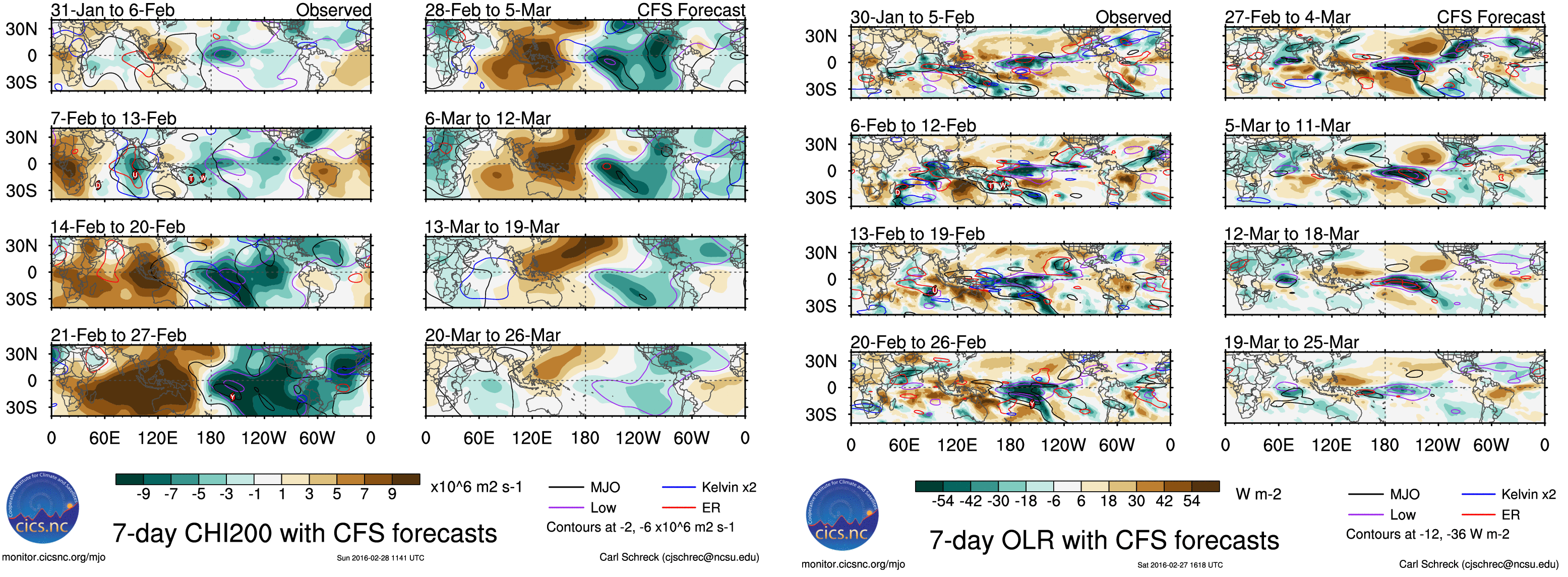 CFSv2 forecast 200mb Velocity Potential anomalies (on the right) and 850mb OLR or convection (on the left). Both indicating tropical forcing gradually diminishing near the dateline in over next several weeks.