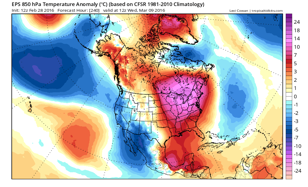The 12z Euro ensemble showing very anomalous warm 850mb temperatures with strong ridge over Eastern United Stateds during 8-10 period.