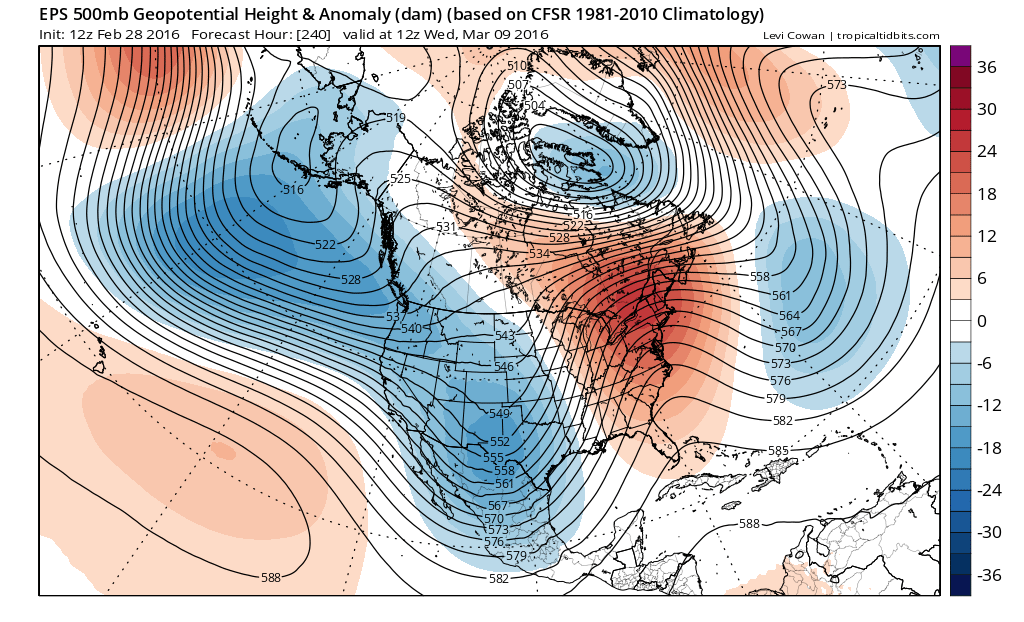 Model and ensemble guidance also shows the North Pacific trough or jet extending further east into West Coast of North America. That will allow for higher heights in the mid and upper levels — and flood the much of the Central and Eastern United States with mild Pacific air. Also the CFSv2 model forecast the tropical forcing with convection to gradually weaken near dateline, as we go through middle to late March and early April.