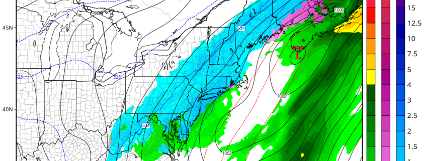 A large and intense low pressure system will form over the Mississippi River Valley and move northward toward the Ohio Valley and Southeast Canada this week, as a result of an impressive phase in the mid and upper levels of the atmosphere. In our area, two distinct areas of low pressure will actually impact our weather; the first from Tuesday into Tuesday Night, and the second from Wednesday into Thursday. Both will feature wildly differing weather conditions, with snow possible across the interior on Tuesday and then heavy rain, warm temperatures, and thunder on Wednesday Night from the second storm system.
