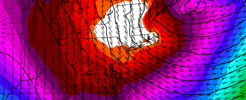 A large arctic airmass, owing to a piece of the polar vortex, will drop southward late this week and weekend from Canada into the Great Lakes and Northeast United States. With it will come the coldest air of the winter — and the coldest air in quite some time, especially aloft. Temperatures at 850mb, or roughly 5000 feet, will drop to nearly -30 degrees celsius, challenging some records for temperatures at that level in the Northeast US for the date.