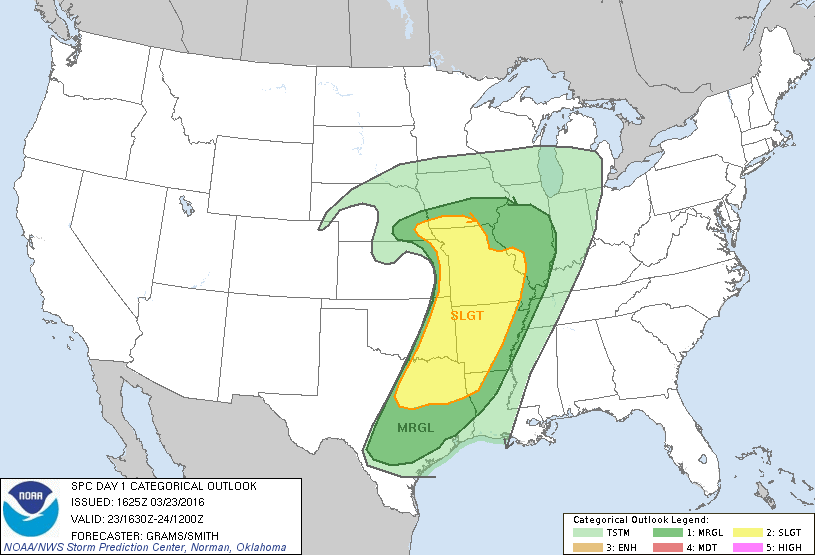 The Storm Prediction Center is a division of the National Weather Service. It is staffed by experts in the prediction of thunderstorms and organized convective events. The Storm Prediction Center issues thunderstorm outlooks for the entire country for Day 1 (today), Day 2 (tomorrow), and Day 3 (the day after tomorrow). They also issue extended outlooks which highlight potential widespread storm events 4 to 7 days in advance.