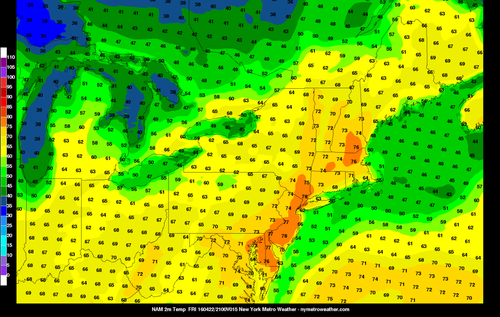 Very warm weather conditions are expected with more clouds will mixing with sunshine today and light southwest winds. High temperatures will reach the upper 70s to perhaps lower 80s this afternoon, despite more clouds. Near the shore, the southerly flow and sea-breezes this afternoon keep temperatures much cooler in the upper 60s to lower 70s.