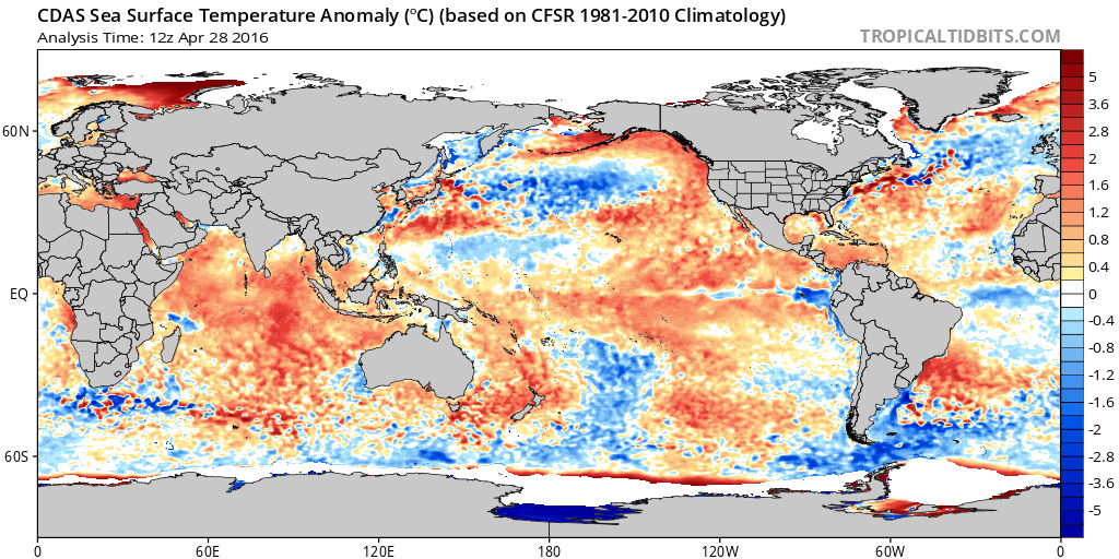 So what is could be causing this split flow pattern? We look out into the Pacific Ocean for some possible answers. First: warmer than normal sea-surface temperatures still over the Gulf of Alaska and Northeast Pacific. The warmer anomalies have persisted for the last two or three years. The PDO value for March was +2.40. When the PDO is in a positive phase, this may be enhancing the ridge with the polar jet over the Northeast Pacific and West Coast. During the summer, these -EPO/+PNA patterns have prevented more prolonged heat waves from occurring.